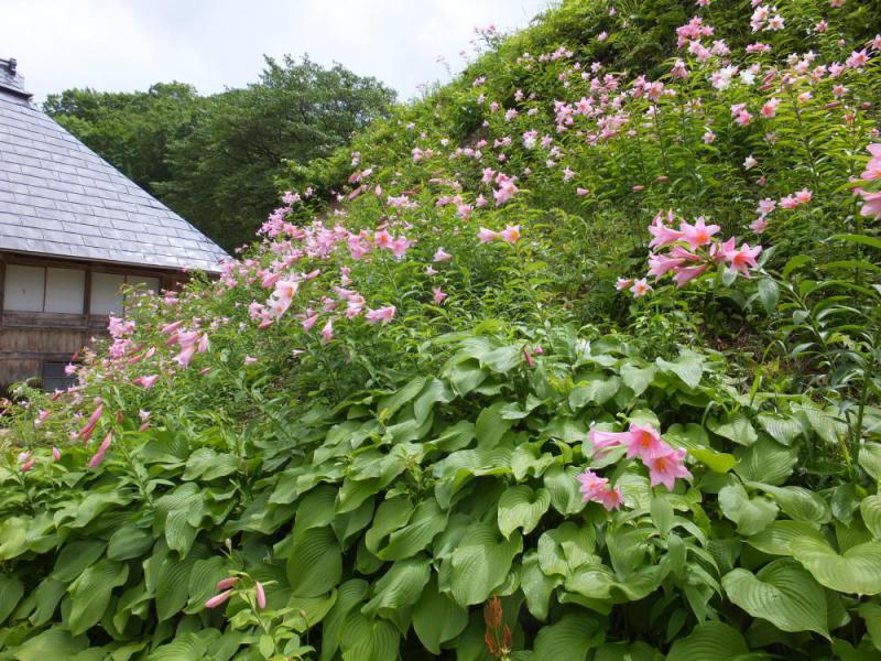 ヒメサユリが今日現在、見事に満開でした。高貴な香りが漂う一帯は、淡いピンクの花が所狭しと競って咲いています。みよ子ばあちゃんが案内してくれます。