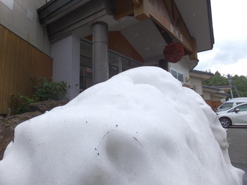 ご来館の皆様方に少しでも涼を楽しんでいただきたく、白川荘の玄関先にドカンと雪の塊を置いてみました。お子さんたちがはしゃぎまわっていました。