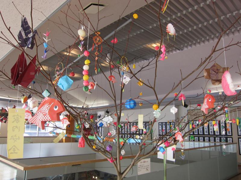 折り紙で作った鶴をはじめ、紙で作った鯛、ふなせんべいなどなど・・・