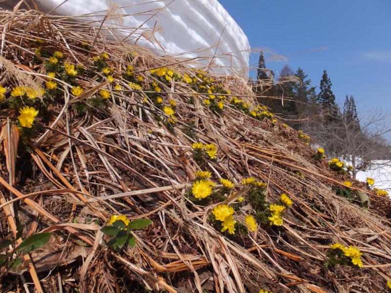 周りを見渡せばまだ2m弱の積雪。でも雪の消え間からは福寿草が一斉に花を開いて、太陽の光を浴びています。春はもうすぐそこまで。