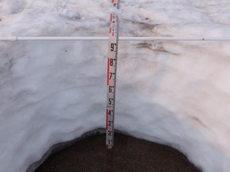 このところ寒い日が続いたことから、なかなか雪解けが進みませんでしたが、今日は幾分温かさが戻りました。ようやく湖岸公園の残雪が95cmまで減りました。
