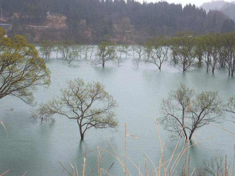 今朝の白川湖。雨の中で柳の芽吹きが始まりました。間もなく桜も開花するようです。