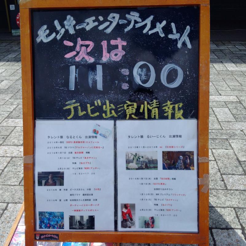 本日5/8日曜日GWイベント最終日です。テレビや映画で活躍中のタレント猿「なるとくん」がくるよ!1回目 11:00〜2回目 13:00〜場所は道路情報館まえショーの目安は15〜20分ぐらいです。ショーの後は「なるとくん」と写真撮影ができるよ〜※大変混雑が予想されますので、お早めにいらして下さい。
