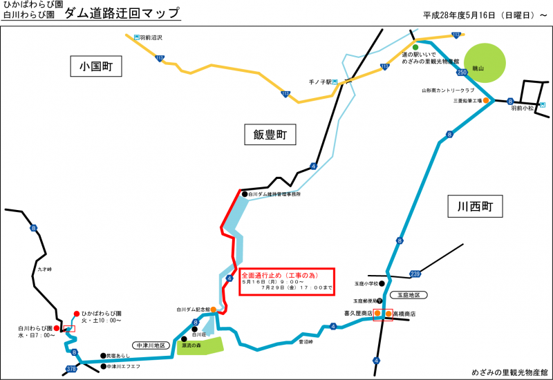 ダム道路が7/29まで工事で全面通行止めのため、迂回路の地図を参考にお気をつけていらして下さい。お待ちしております。