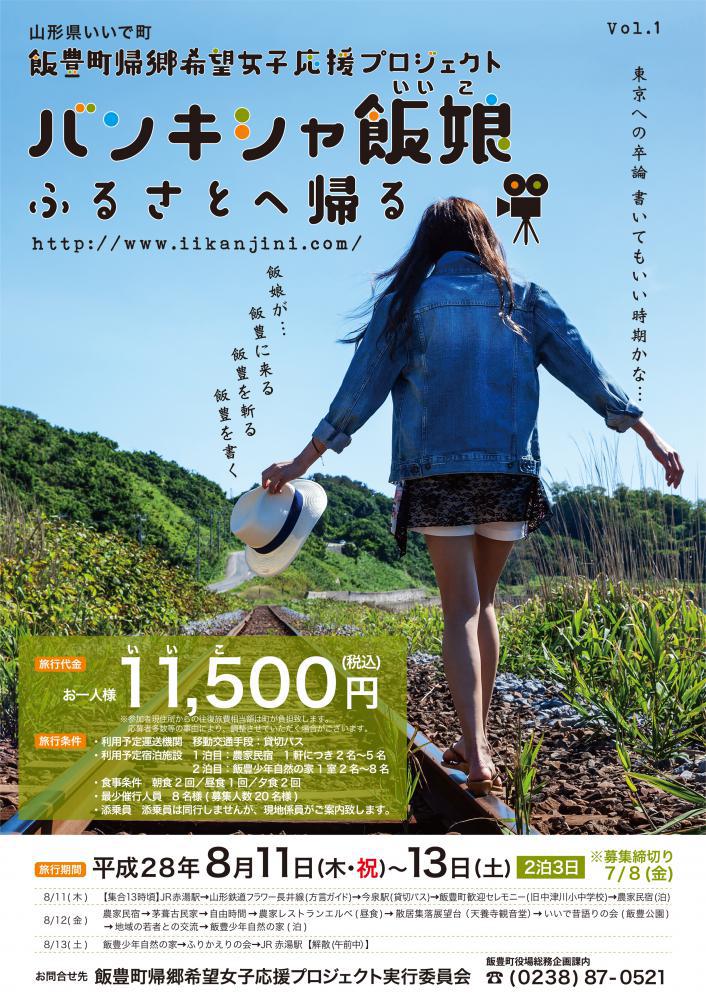 帰郷希望女子プロジェクト、まだまだ募集中('◇')ゞ〜バンキシャ飯娘(いいこ)ふるさとへ帰る〜上京した飯豊っ娘向けツアーイベント参加者大募集中です!!都会の荒波にもまれ、人酔いに慣れてきたんだけど… なんかふるさとの山が恋しい、たまに実家にも顔ださなきゃな〜。 って、なんとなぁ〜く帰郷を考えているそこのあなたっ(゚Д゚)ノ地元にちょっと戻ってきて、飯豊の良さを再確認しませんか?(*‘∀‘)♪参加者はバンキシャとなり旅の旅行記を綴り形に残します。募集締め切りが7/8となっておりますが、募集を大幅に延長してより多くの参加者を募る事になりました!!募集締め切り7/29まで!!どしどしご連絡くださいませ〜(*‘∀‘)お問い合わせ先 飯豊町役場総務企画課内飯豊町帰郷希望女子応援プロジェクト委員会TEL:0238-87-0521※もちろんコンセプトに共感した方ならどなたでも参加OKです!(飯豊町近郊でもね!)