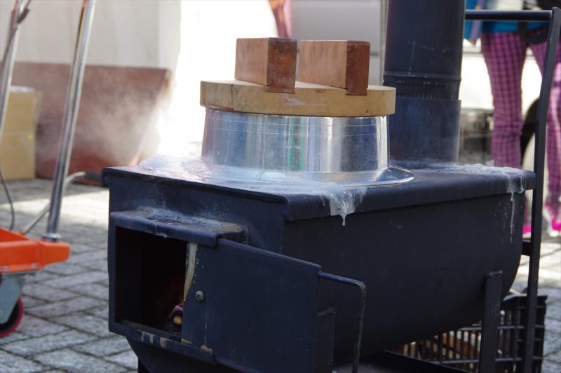 薪かまどで炊いた「新米つや姫」の試食販売をはじめ、薪ストーブのプロが窯で焼いた絶品ピザ、