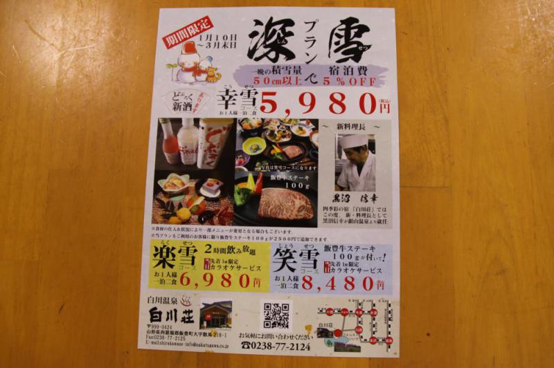 お待たせしました。白川荘深雪プランが1月10日からスタートします。一晩で新雪が50cm以上降り積った場合は、その夜のご宿泊代の5%を割引きいたします。 幸雪コース ¥5,980(一泊二食付) 楽雪コース ¥6,980(一泊二食付・2時間飲み放題付) 笑雪コース ¥8,480(一泊二食付・飯豊牛ステーキ付)