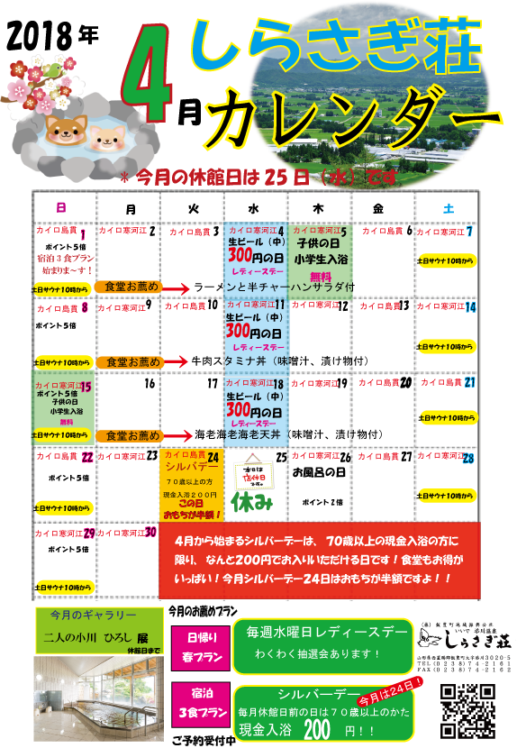 レディースデーがあったりシルバーデーが始まったりと4月からのしらさぎ荘もお客様に喜んでいただける企画満載で頑張ります!どうぞよろしくお願いいたします。