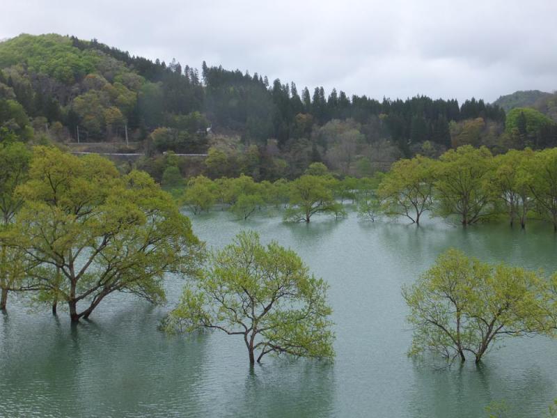 久々の雨、水中の木々の緑が日増しに濃くなってきました。昨日までの水没林取材の報道各社の姿は無く、ひっそり静まり返った白川湖。とーってもきれいですヨー。