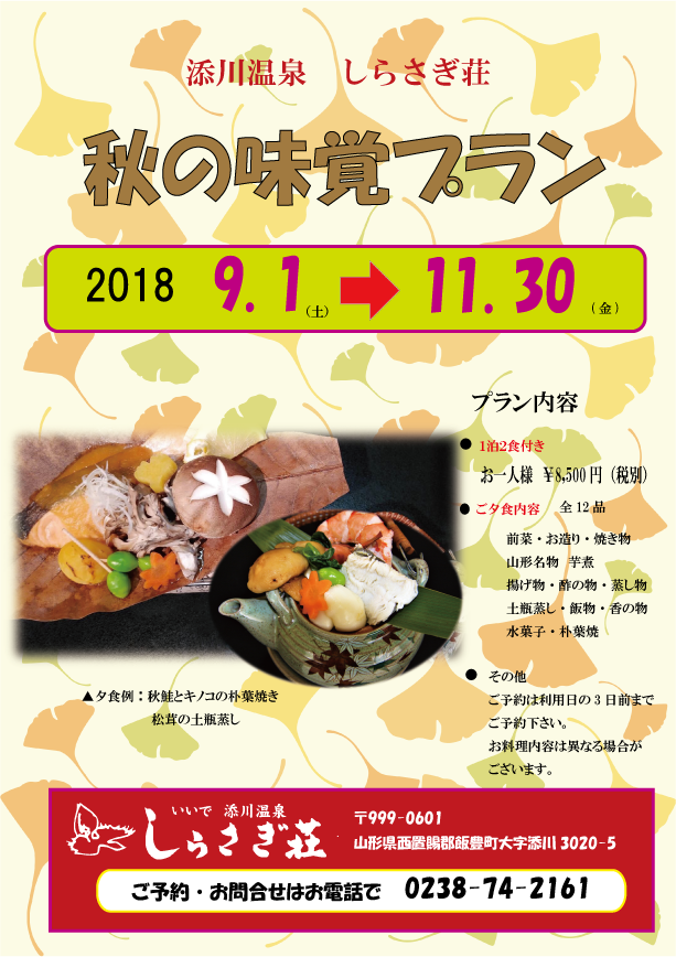 今年の夏は猛暑です!なんて言ってましたが、今日の朝は寒くて起きてしまいました。 あっという間に秋が来ます…。 秋は食欲の秋!芋煮の秋ですね! 宿泊 ( 味覚プラン )でご宿泊下さい