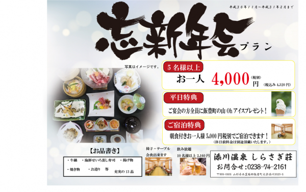 11月から来年2月までの期間で忘新年会プランを企画致しました。平日ご利用のお客様には地元の山Ohアイスアイスをプレゼントします。忘年会、新年会はしらさぎ荘で…。良いと思いますよ〜。