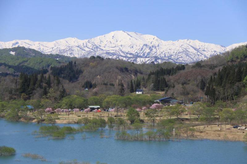 飯豊山の白に湖の青。 新緑の薄緑に、桜のピンクがとても印象的。 これぞ中津川の真骨頂。大型連休も最終日、来週12日は全国白川ダムマラソン大会でお待ちしてまーす。まだまだ桜が楽しめます。