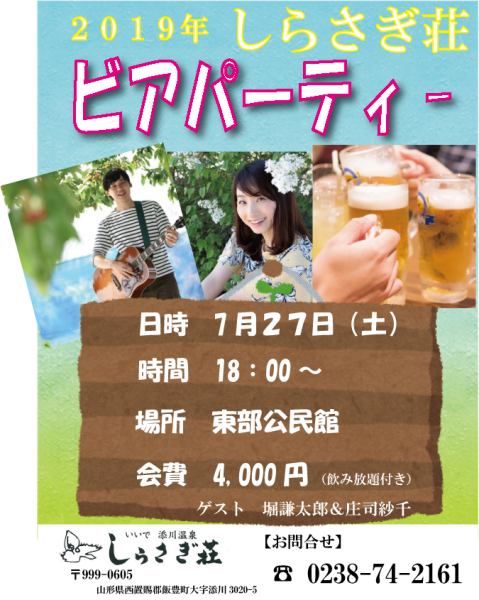 今年もしらさぎ荘ビアパーティが7/27開催されます。堀謙太郎さんと庄司紗千さんをお迎えして楽しく開催いたします!ドリンク飲み放題!短い夏を一緒に楽しみましょう!チケット4,000円お求めはフロントまで。