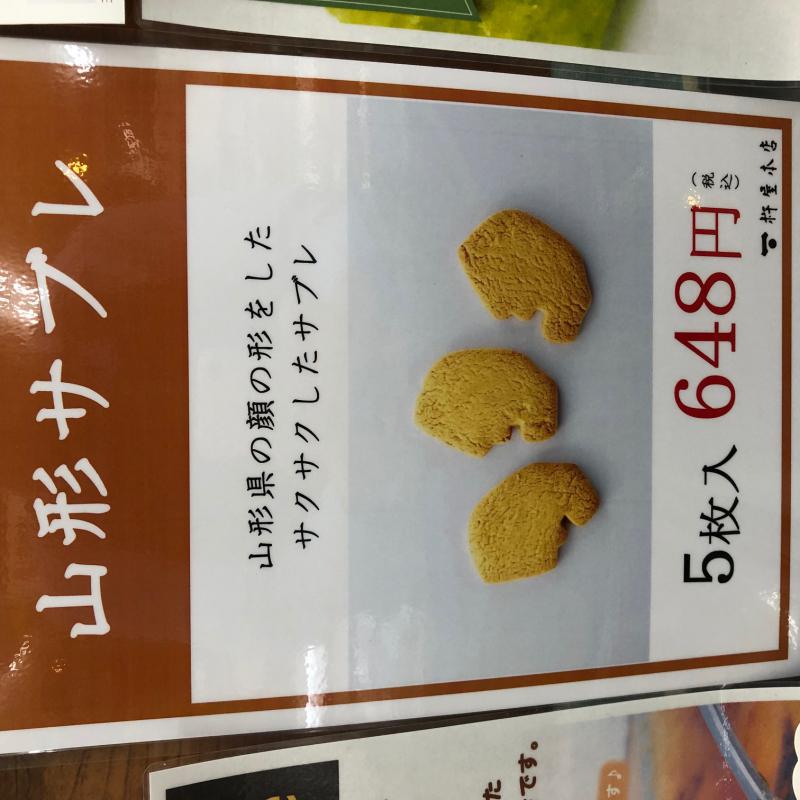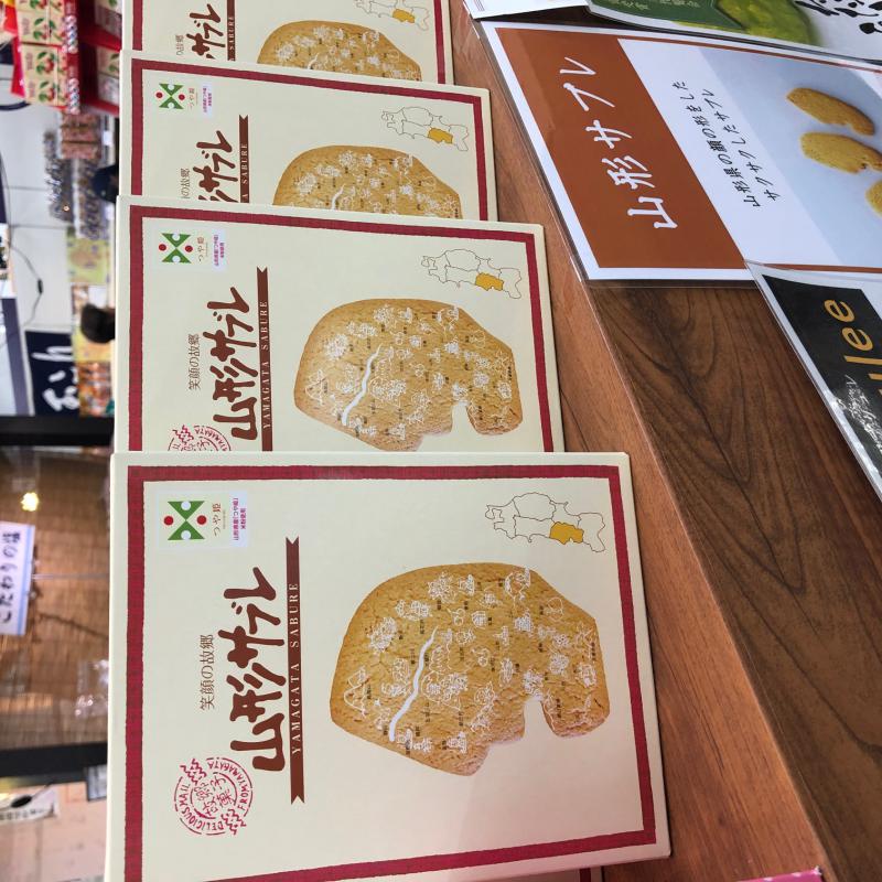 創業文化八年(1811年)の杵屋本店さんの「山形サブレ」!山形県の形、人の顔が横を向いているような変わった形そのままサブレに!パッケージには山形の名所を地図のように書きしるされています!