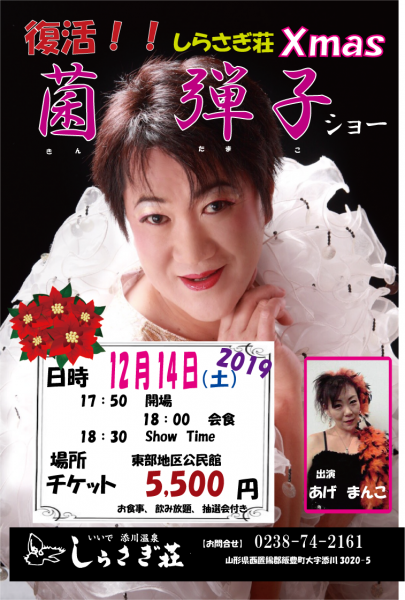 菌 弾子ショーが決定しました!癖のあるショーを是非ご堪能下さい! *期日 12月14日 *時間 17:50会場 18:00会食 *チケット代 5,500円 お問合せはしらさぎ荘フロントまで