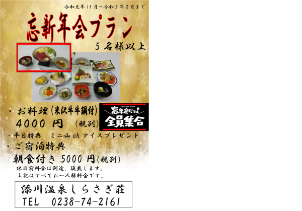 来年、2月までのプランです。是非ご利用下さい。 又、ご予算に応じて宴会も承っております。お気軽にお問合せ下さい。