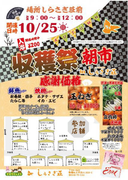 今年も、時間短縮ではありますが、しらさぎ荘秋の収穫祭を開催させて頂きます。置賜の皆様のあたたかいご協力をいただいて、出店ジャンルも様々です!収穫祭の時間だけだはありますが、入浴も200円で入れますよ! 25日はどーぞしらさぎ荘にお越しください。