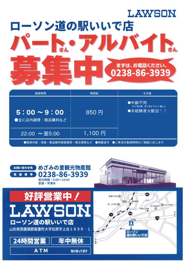 ▼ローソン道の駅いいで店 スタッフ募集のお知らせ