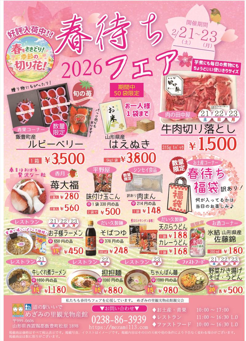使いきりサイズの牛肉切り落としや山形県産はえぬきを大特価で販売!飯豊町産のとちおとめ「ルビーベリー」やいちご大福など春の訪れが待ち遠しくなる商品をそろえて皆様のご来館をお待ちしております!