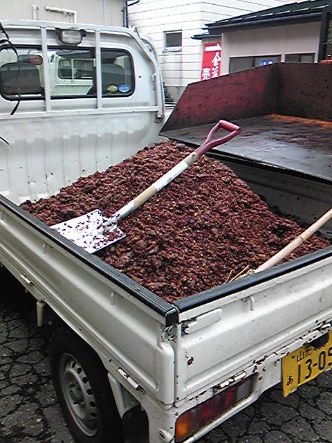 仕込みが終わってデラウェア種の皮を軽トラックに運んでいるところです。