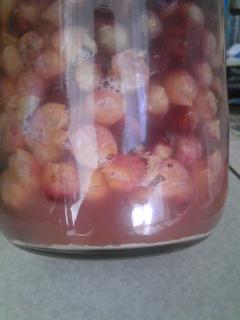 デラウェアのマセラシオンカルボニック五日目です。発酵が加速されて、ぶどうが浮かんでます。