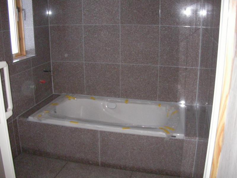 お風呂の壁と床、バスタブエプロンに桜御影石を施工しています。