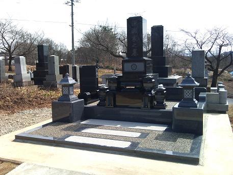 ○あやめ型 9.0×9.0(尺)インド産黒御影石と中国産青御影石で作らせて頂きました。お施主さまのご要望により花立てを2対設置しております。また砂利は樹脂で固め、掃き掃除が可能な仕様となっております。高台にある墓地のため正面にスロープを作りその周りを芝生で覆わせて頂きました。石と緑はとても良く合います。山形県飯豊町に施工させて頂きました。2010年4月お引き渡し。