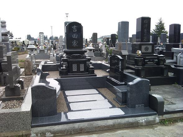 ○セレブ型 6.9×10.5(尺)インド産黒御影石を使用したお石塔。画期的な納骨方法と洗練されたデザインのセレブ型は近年多くのお客様からご支持を頂いております。ベンチを備え付けた外柵は亡き人とゆっくり語らえる設計になっています。亡き奥様のためにご主人とご家族がお建てになられました。生前の奥様の優しい笑顔が思い出されます。山形県長井市に施工させて頂きました。2010年5月お引き渡し。