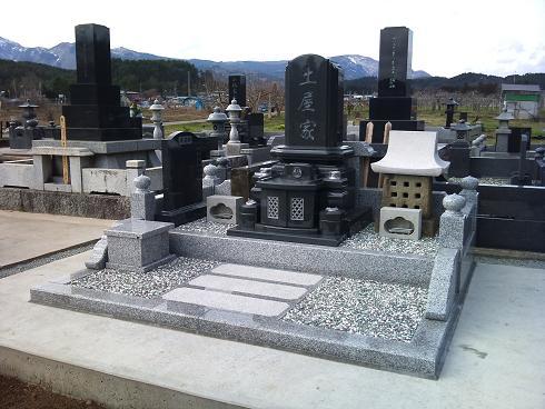 ○セレブ型 9.0×8.0(尺)人気の高いセレブ型。奥様のご意見が採用されました。ご納骨方法とデザインに惹かれたようです。お石塔の隣にある『万年堂』は笠石が割れていたため御影石で制作致しました。濡れると錆色になる石ですが表面を叩き仕上げにしていますので数年で既存部分と馴染んだ色具合になってきます。山形県白鷹町に施工させて頂きました。2010年4月お引き渡し。