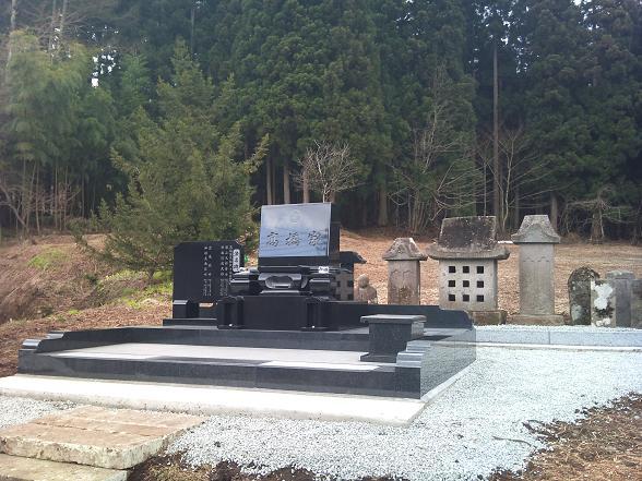 ○洋型あやめ23号 10.0×8.0(尺)たくさんの古いお墓を後ろにきちんと設置し直し新たに洋型のお石塔と外柵を建立させて頂きました。洋型といっても近年多くなったデザイン性の強いお墓とは違い、安定感と安心感のある基本的な形です。墓地の立地といい、大きな万年堂といいご先祖様を大切にされてきたことが伝わってくるお墓です。山形県朝日町に施工させて頂きました。2010年5月お引き渡し。