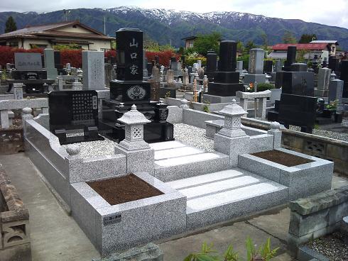 ○あやめ型 10.8×11.7(尺)インド産黒御影石あやめ型11号と白御影石の外柵。お花を植える花壇が欲しいとのお施主さまのご希望で入口両側に設けさせて頂きました。根のあまり張らない草花をお植えになられる方が最近増えてきたように思われます。ホームセンターにも花々が多くみられる時期になってきました。明るくあたたかいお墓になることと思います。山形県長井市に施工させて頂きました。2010年5月お引き渡し。