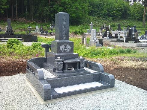 ○1坪タイプ 6.0×6.0(尺)古くからの墓地のため非常に大きな面積にお骨が土葬されていました。今回土葬のお骨を改葬させて頂き1坪タイプのお墓をご建立致しました。吸水率の少ない青御影石でお石塔、外柵共に同じ石での施工です。山形県長井市に施工させて頂きました。2010年5月お引き渡し。