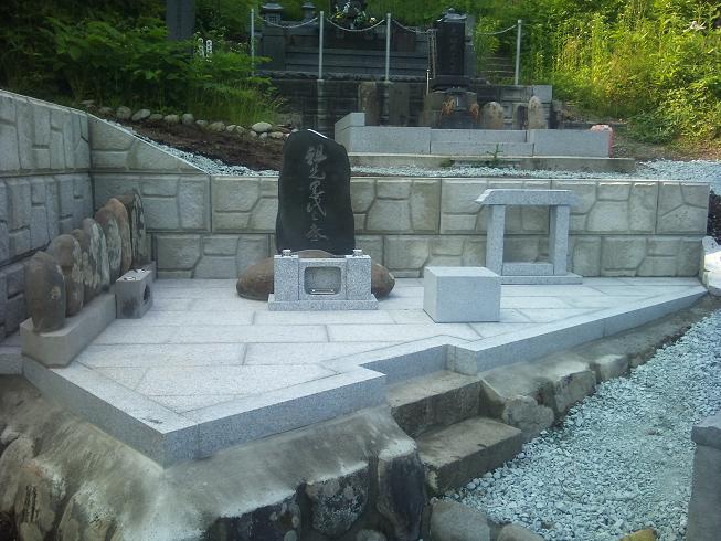 ○墓所リフォーム 16.0×6.0(尺)これまでは後ろから迫ってくる法面と崩れかかっている玉石積みが墓所を形成していました。今回その法面に土留用FTブロックを積み墓所全体を15pかさ上げし、石張りをさせて頂きました。 既存のお石塔をクリーニングしこれまでより広く感じる墓所になりました。山の斜面にお墓がある方は土留めをされると墓所全体が広く使うことができます。ご参考まで…。山形県寒河江市に施工させて頂きました。2010年6月お引き渡し。