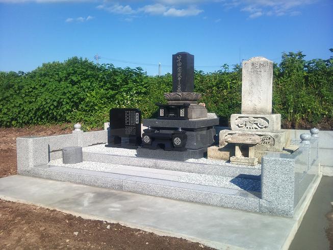 ○地上納骨堂へリフォーム 15.0×8.4(尺)古くからの家系で以前に建てられたお墓が大変立派なものでした。ただ、年月の経過と軟石(軟らかい石)の風化、後ろにある畑からの土の落下にて墓所全体をリフォームさせていただくこととなりました。中心にあるお石塔の上2段は既存のものを利用し、新しい地上納骨堂を設置致しました。右側には細かい彫刻が施されたお石塔を再建立。御先祖様がお建てになられたお墓を大事になされリフォーム完了です。山形県米沢市に施工させて頂きました。2010年6月お引き渡し。