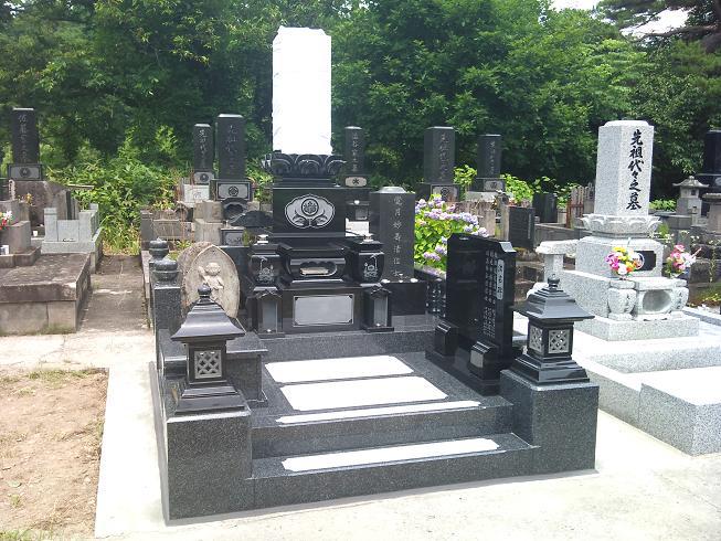 ○あやめ型上蓮華付き 7.0×9.0(尺)弊社基本和型石塔あやめ型に上蓮華をつけた高級タイプです。外柵は丸柱や雲竜型の羽目やギボシ等とても細部まで手の込んだ作りとなっています。墓地内でもとても目をひく作品となりました。山形県西川町に施工させて頂きました。2010年7月お引き渡し。