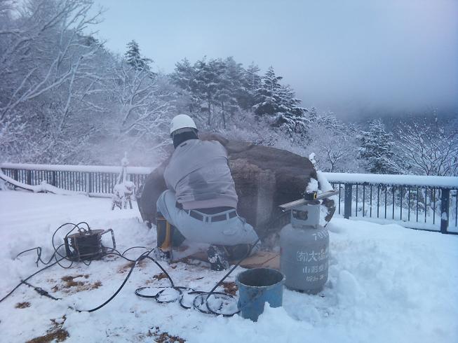 とうとう雪が本格的に降りそうな気配…。そんな中ほとんど完成しております長井ダムの脇に向かう当社の職人。弊社きってのヘビー級の彼。体のわりに細かい仕事もこなす器用な彼が向かう相手は庭石などに用いられそうな原石。その石に銘板をはめ込むために雪の降る中作業中です。後姿がなぜかアメリカなどにありそうなフィギュアにみえてしまうのは私だけでしょうか…。