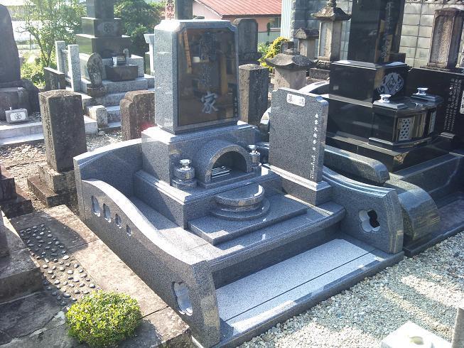 ○ルーン+ガーデンU型 5.8×5.7(尺)お石塔ルーン型は青御影石で作成させて頂きました。 ただ、文字を彫刻しますとこの石はその部分が見えにくくなります。そこで黒御影石をはめ込み、文字の彫刻に白、黒のコントラストをはっきりとすることで文字への塗料入れを行わずに済むようにしております。外柵は花模様のように丸く貫いてありますのでお洒落に、そしてスタイリッシュに仕上がりました。山形県寒河江市に施工させて頂きました。2010年9月お引き渡し。