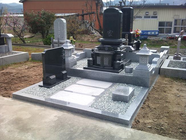 ○セレブ型 7.8×9.8(尺)近年大変多くの方々からご支持頂いているこのお石塔の形は、位牌の形がモチーフになっているので年配の方でも受け入れやすいことがほんと良くわかります。また石塔の幅が1尺6寸ありますから自ずと彫刻する文字の大きさも大きくなり、また深く彫られます。文字の形、彫り方など当社が自信を持って責任施工・責任加工させて頂いております。山形県長井市に施工させて頂きました。2011年5月お引き渡し。