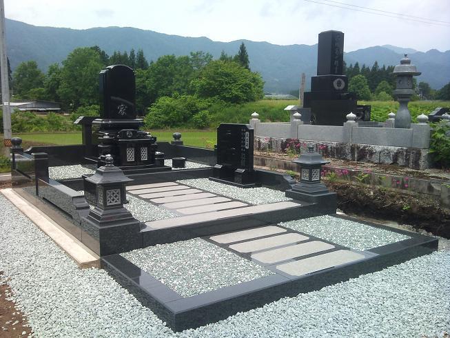 ○セレブ型 9.0×16.0(尺)外柵には落ち着いた色合いの石種を使いお石塔の黒御影石とのバランスを第一に考えました。入り口部分と奥とでの高低差が大分あるため踊り場を下げ、無理なくお参りできるようにゆったりとした設計になっています。山形県白鷹町に施工させて頂きました。2011年6月お引き渡し。