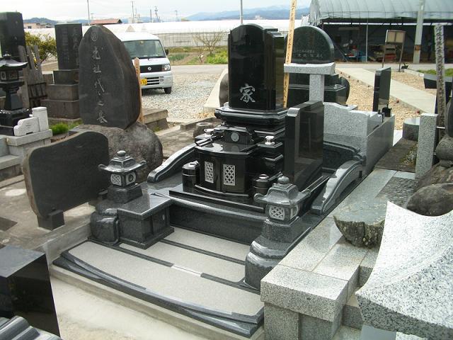 ○セレブ型+室戸型 6.0×8.0(尺)外柵と灯篭はお施主様からの『デザイン性の強いもの』とのご要望から近隣墓地との兼ね合いも考え室戸型をご提案させて頂きました。6尺×8尺という寸法は山形県内では大きい方ではありませんがセレブ型との組み合わせによりお参りするスペースが十分確保でき、角が蕨になっている灯篭との相性もピッタリ。とてもバランス良く仕上がっています。山形県寒河江市に施工させて頂きました。2011年4月お引き渡し。