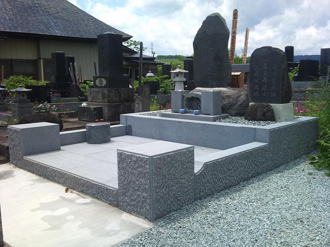 ○既存石塔+古代型 8.0×10.0(尺)既存の蔵王石のお石塔は台座を加工し花立、香炉等を同じ蔵王石で新設しました。外柵は青御影石のノミ切り仕上げに額縁を取り全体に『昔ながらのお墓』をコンセプトに仕上げました。あえて磨かずにお石塔との調和を大切にしました。山形県大江町に施工させて頂きました。2011年4月お引き渡し。
