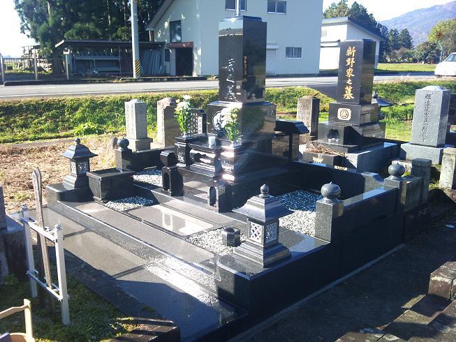 ○あやめ型 10.5×9.0(尺)インド産黒御影石クンナムEを使用した尺1寸角あやめ型。雨上がりのため必要以上に反射していますが…。亡き人への想い、お施主様ご家族のお気持ちが詰まったお墓です。山形県長井市に施工させて頂きました。2010年11月お引き渡し。