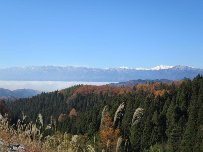 国道348号線から白鷹町方面を望みます。 朝日連峰、祝瓶山はもう真っ白です。 まだ少し残る紅葉と風に揺れるススキ。 そして今時期よく目にすることのできる雲海です。