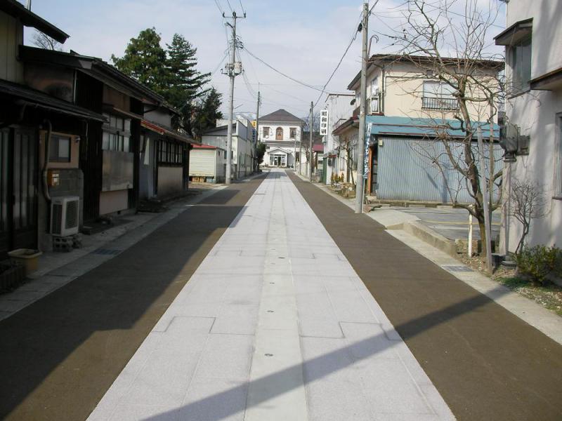 長井市大町地内、かく長そばやさん角から旧郡役所である小桜館まで伸びる道路の改修に伴い道路センターにある消雪用配管の両側を石畳にさせていただきました。 今後小桜館でのイベントなどでうまく活用していただけると施工させていただいた我々としてもうれしく思います。画像では白く感じますが淡いピンク色の桜御影石を使用しています。