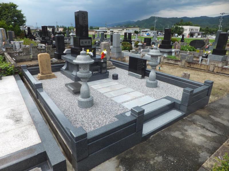 これまで芦野石一段積の外柵だったのですが このように 側面と後面の三方は利用し前面と階段を青御影石に交換、羽目や塔婆立を新設し化粧砂利を樹脂で固める方法にリフォームです。 2013年7月 山形県長井市に施工させていただきました。