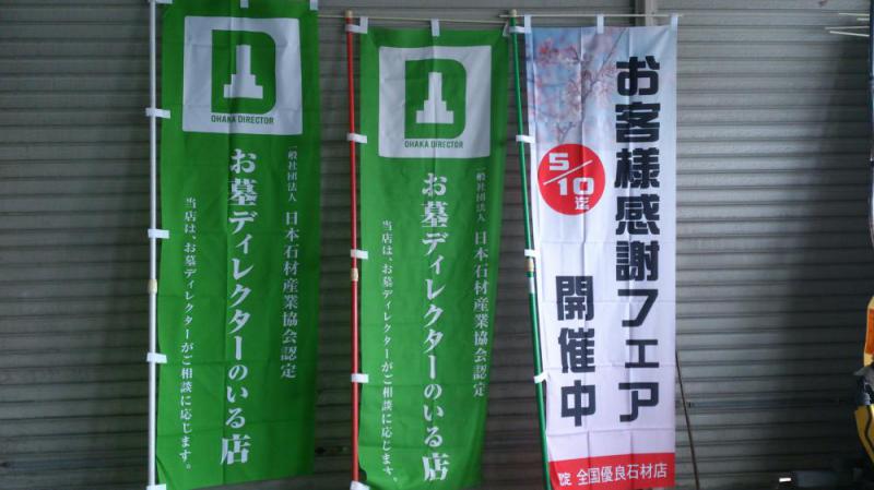 連日のぶり返した大雪に疲弊している当社ですが3月ももう中旬…。折込チラシなどにも同業者やお仏壇屋さんの広告が目立つようになってきました。 というわけで雪にも負けず、朝一から展示場の除雪も終わり、幟(のぼり)の準備をしました。 TOP画像の右端は当社オリジナル幟です。当社も認定されている全国優良石材店の会のお客様感謝フェアが開催中ですのでその告知のために数年前に作りました。全優石本部には最近使いたいと思う幟がなく幟の原稿などの制作を手掛けている親戚に必要なものは依頼しています。 ターポリンの入り口看板もオリジナルです。 さて先日UPしたように明日からお墓想談会を開催します。が、雪の予報です…。 土日祝日営業致しますのでお天気のいい時をねらってご来店いただけると幸いです。 そろそろ雪は止んでいただいて結構ですm(__)m