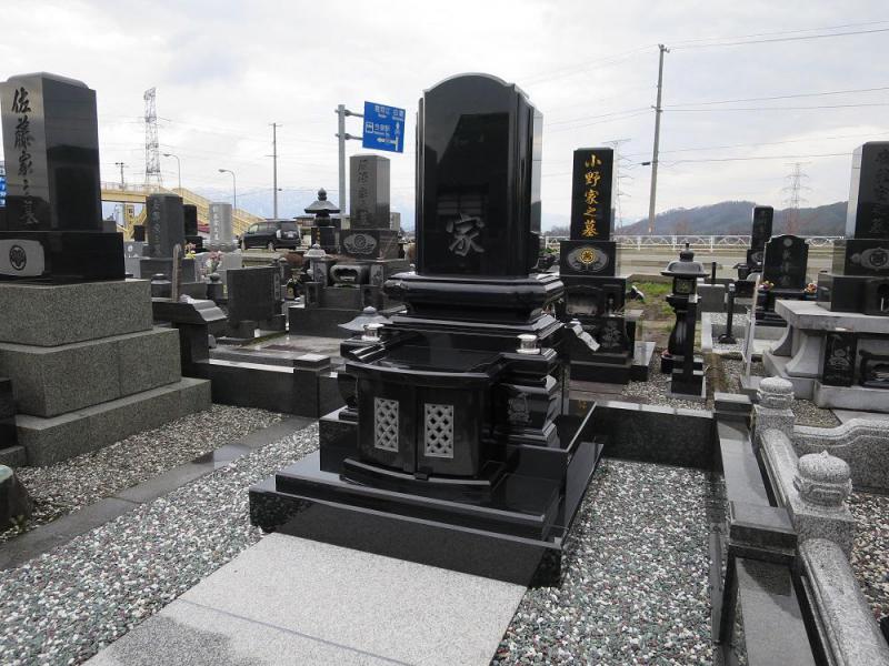 ○葵型(芝台追加タイプ)インド産高級黒御影石 クンナムで建立させて頂きました。すでに外柵が20年以上前に作られていましたのでそこにお墓を施工致しました。芝台を追加した形ですので高さが増したことで隣とのバランスも保てました。 山形県長井市に施工させて頂きました。