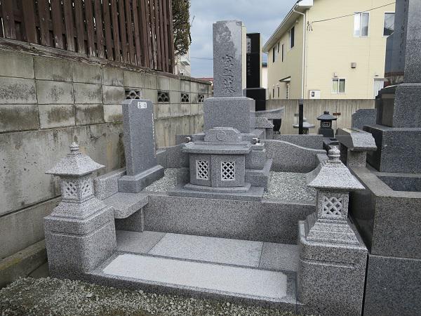 ○うるおい型 国産材の『真壁小目』を使用した綺麗なお石塔です。約7尺角の墓地に灯篭とベンチをご希望頂きましたので片側にベンチを設け、ゆっくりと語らって頂ける場をつくることができました。 山形県長井市に施工させて頂きました。