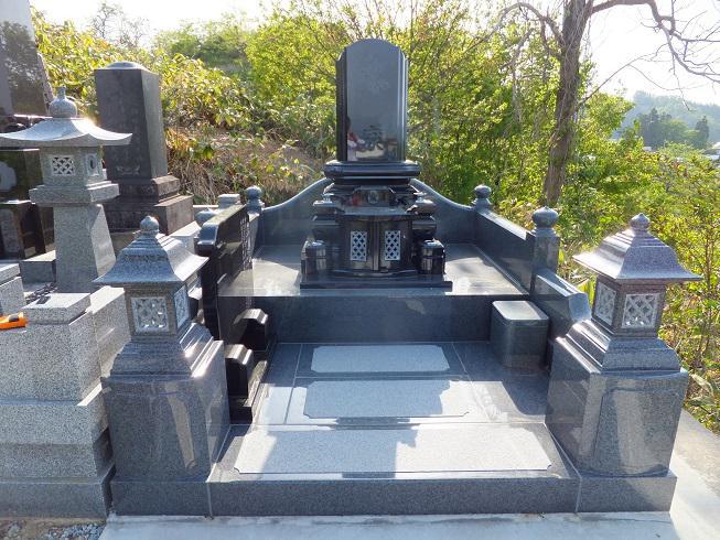 ○葵型 インド産黒御影 クンナムEで製作の葵型。青御影の外柵との色合いがマッチしています。墓地面積は間口7尺 奥行9尺です。 山形県寒河江市に施工させて頂きました。