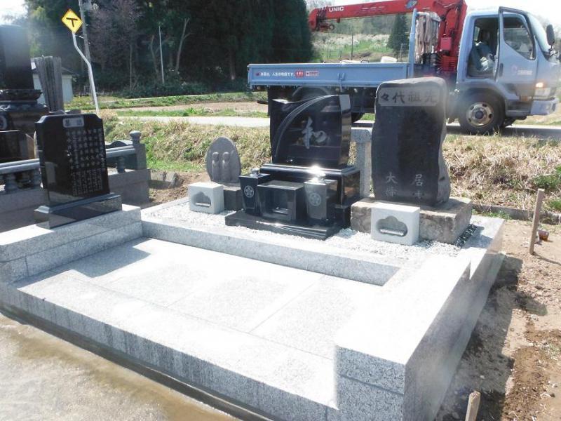 ○ストリギス型 流れるような曲線を高度な加工技術で表現したお墓です。品が良くお洒落なデザインがとても印象的です。 山形県大江町に施工させて頂きました。